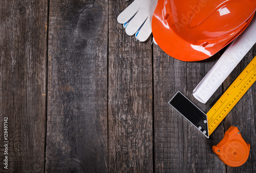 construction, tool, background, wooden, building, renovation, wood, work, equipment, toolbox, tool, board, improvement, industrial, hardware, home, industry, space, copy, object, repair, construct, woodwork, handyman, set, nobody, closeup, rustic, professional, vignetting, document, development, engineering, plan, blueprint, project, architectural, architecture, engineer, planning, glove, hat, helmet, ruler, measure, tape