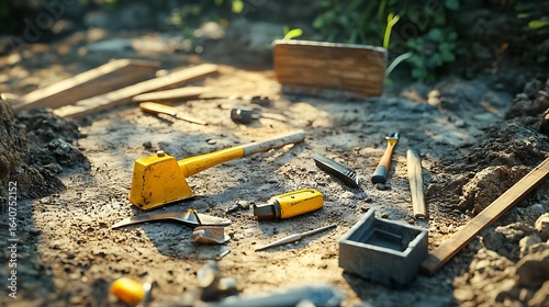 construction, tool, dirt, ground, work, daytime, yellow, wood, metal, axe, hammer, building, repair, demolition, digging, site, construction site, construction work, brown, equipment, renovation, building material, construction industry