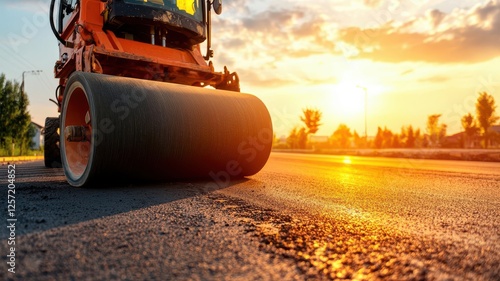 Construction vehicle compacting asphalt during a sunset, showcasing industrial work.