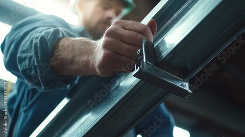 Construction worker aligning beams for building framework. Featuring strength and precision