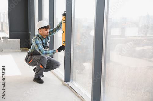 Construction worker checking window level with spirit level in modern building