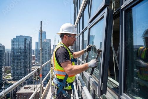 Construction worker in a hard hat and safety gear installs a glass window on a high rise skyscraper