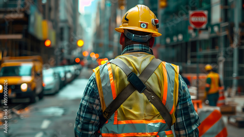 construction worker, city street, hard hat, roadwork, construction site, city landscape, urban development, labourer, safety-gear, infrastructure, blue-collar, construction industry, manpower, manual labor, heavy equipment, city life, job site, traffic safety, industrial, city landscape, city, street, person, traffic, construction, uniform, protection, hat