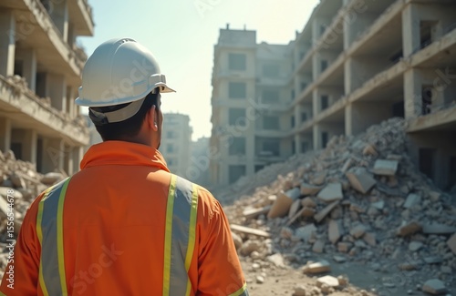 Construction worker in hard hat surveys ruined building after disaster. Assesses damage. Looks at debris, collapsing structure. Civil engineering, demolition site. Disaster relief worker, planning
