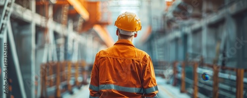 Construction worker in orange safety gear and helmet in an industrial setting. Focused on structures with blurred background.