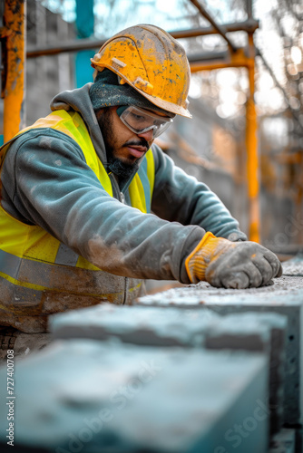 Construction Worker Laying Bricks. A focused worker lays bricks carefully, ensuring alignment and stability.