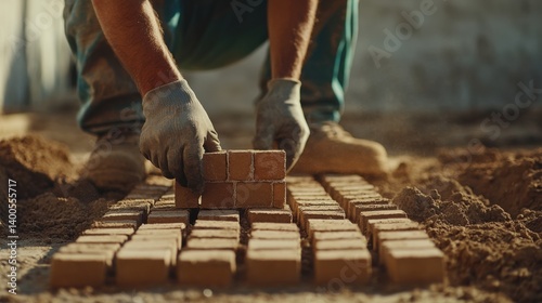 Construction worker laying foundation bricks for a wall. Featuring craftsmanship and technique