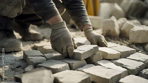 construction, men at work, stone, paver, glove, hand, laying, brick, cement, site, work, building, material, labor, industry
