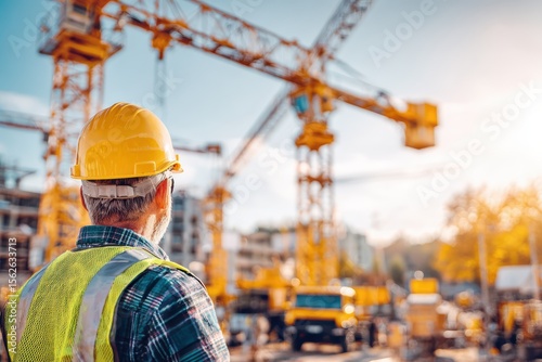 Construction Worker Observing Worksite Progress with Cranes and Heavy Machinery Under a Bright Sky at Sunset in a Busy Urban Environment