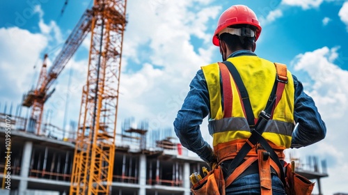Construction worker on a high-rise building site, wearing a safety helmet and harness, showcasing urban development