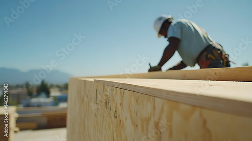 construction, men at work, roof, wood, plywood, hammer, building, clear sky, mountain, city landscape