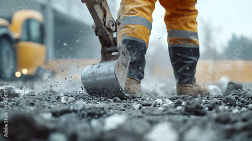construction, men at work, shoveling, digging, dirt, site, work, boot, safety-gear, industrial, equipment, bucket, ground, debris