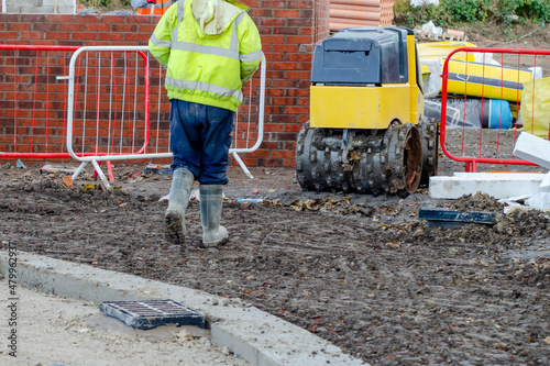 Construction worker operating remote controlled trench compactor to compact ground around new build residential house