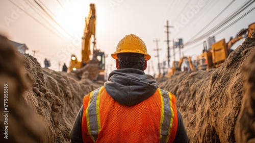 Construction Worker Overseeing Site Excavation: Safety Vest, Hard Hat, Trench Work, Heavy Machinery and Infrastructure