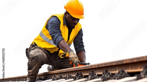Construction worker repairing train tracks railway photography urban environment close-up view industrial safety focus