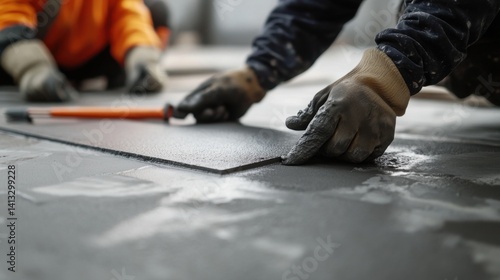 Construction worker sealing joints on a concrete surface at a building site. Featuring focus and technique