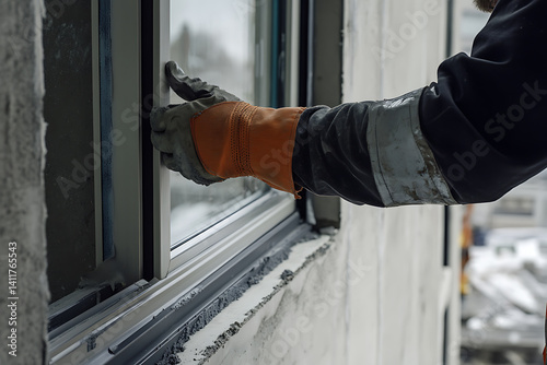 Construction worker sealing windows on a building site. Featuring window installation and site safety