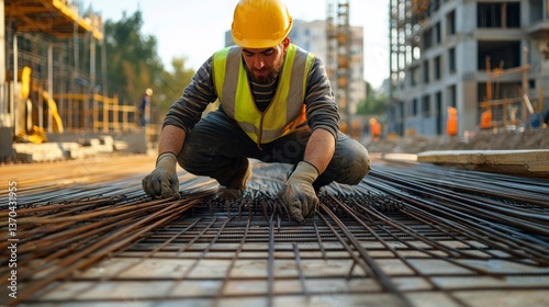 Construction Worker Securing Rebar on Construction Site Wearing Safety Gear