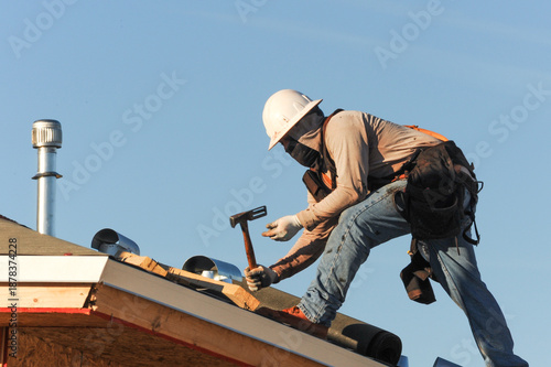 Construction worker using a roofing hammer on the roof structure of a wooden house under construction, representing exterior finishing work and active housing construction operations