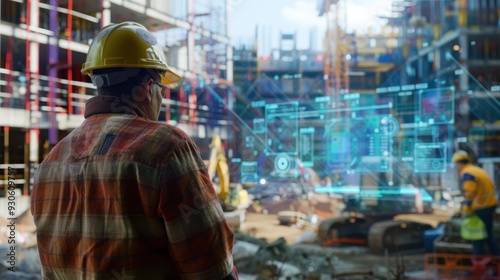 Construction worker wearing a hard hat, looking at a construction site with augmented reality overlays