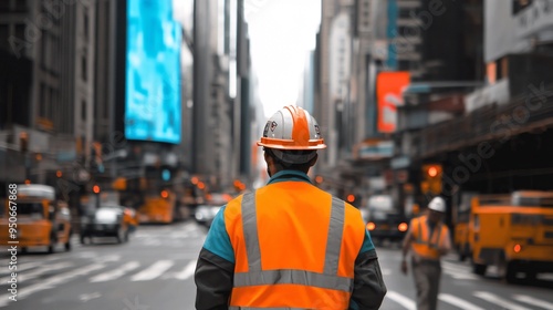 Construction worker wearing safety gear including a helmet and high-visibility vest on a busy construction site