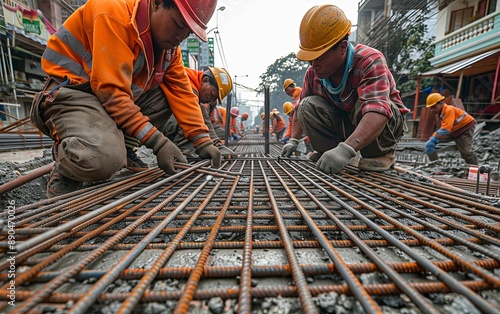 Construction workers are producing reinforcing bars at the construction site.