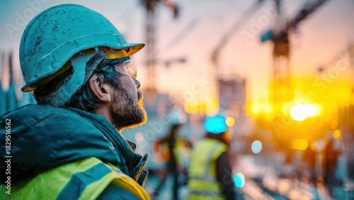 Construction workers at building site with cranes at sunset