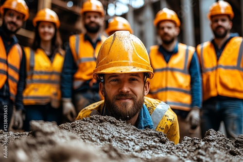 Construction workers in orange safety vests and helmets pose at site, showcasing teamwork and dedication. foreground features smiling worker with pile of gravel