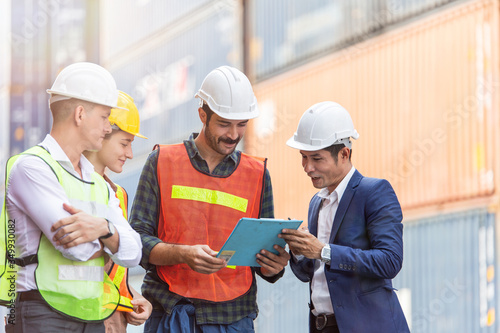 Construction workers look at clipboard while foreman discussing new project at container warehouse. Logistic shipping business work planning. corporate teamwork concept. freight cargo background