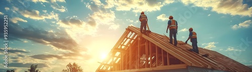 Construction Workers on Roof Framing at Sunset