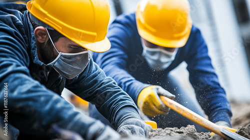 construction, men at work, safety, helmet, industrial, tool, mask, precision, teamwork, sharpened, craftsmanship, manual, labor, work, skilful, professional, site, hard hat, industry, collaboration, morale, productivity, blue, collar, apparatus, active, concentration, process, suit, engineering, task, team