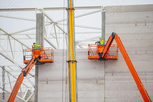 Construction workers working on large scale telescopic boom lift platforms for massive warehouse and factory building. Industrial big lift platforms helping construction business to grow