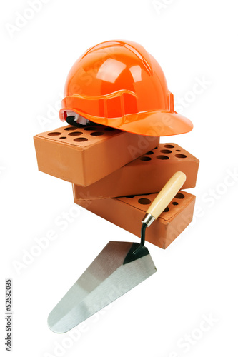 bricklayer, brick, hard hat, mason, built structure, construction, work tool, helmet, trowel, block, idea, equipment, concept, industry, isolated, working, orange, occupation, architecture, white, hat, isolated on white