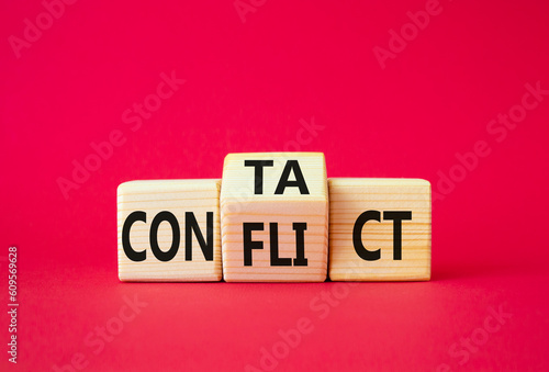 Contact and Conflict symbol. Wooden cubes with words Contact and Conflict. Beautiful red background. Contact and Conflict and business concept. Copy space
