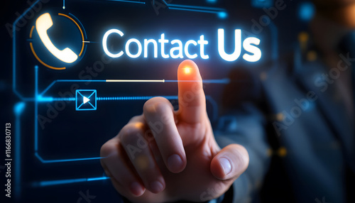 Contact Us Concept, Hand Pointing at Digital Contact Interface, Customer Support and Communication, Reaching Out, Digital Contact Us Interface with Icons