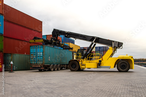 Container handlers. Forklift truck in shipping yard. Industrial container logistic yard. Logistics import export concept.