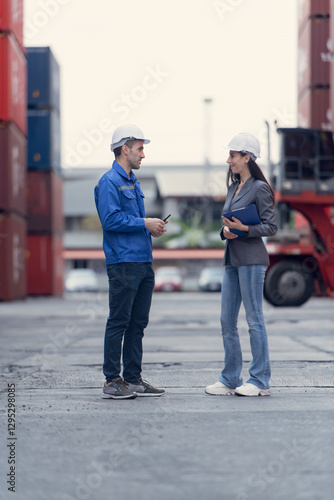 box, business, car, cargo, caucasian, clipboard, commerce, container, control, delivery, equipment, explain, export, factory, female, foreman, hard hat, helmet, import, industry, inspection, inspector, logistic, looking, male, man, management, manager, manufacturing, people, professional, safety, shipping, site, stack, storage, survey, technology, transport, transportation, truck, uniform, warehouse, woman, work, men at work