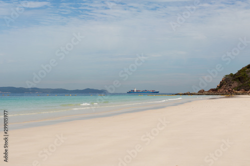Container shipping by the sea. Sand beach tropical summer background. Cargo ship.