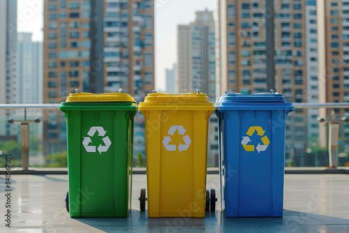 Container trash bin for recycling with city background. Yellow, green, blue bins for recycle plastic, paper and glass trash. Environmental awareness, recycling, waste management concept