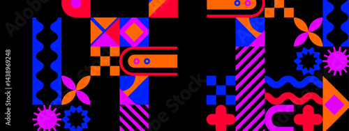 Contains geometric shapes in various colors and patterns. Suitable for graphic design projects, packaging, or abstract backgrounds. Ideal for digital marketing.