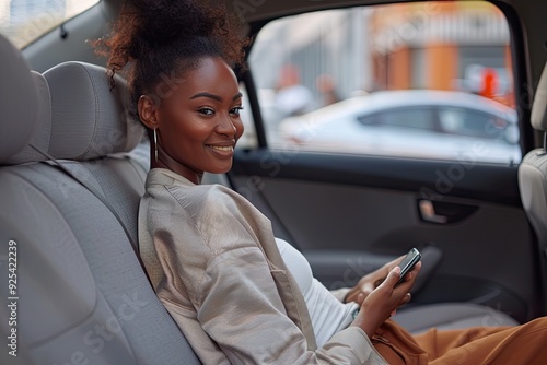 businesswoman, horizontal, one person, photo, transportation, business travel, color image, people, sitting, taxi, business, businessperson, mobile phone, adult, car, day, selective focus, travel, ceo, confidence, connection, contemplation, entrepreneur, finance, individuality, cyberspace, journey, lifestyle, message, occupation, passenger, reading, suit, phone, woman, smiling