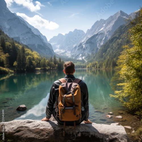 traveler, backpack, serenity, mountain, nature, peace, hiking, wilderness, exploration, scenic, tranquil, meditation, adventure, majestic, landscape, water, forest, solitude, calmness, journey, wanderlust, mountain chain, clearwater, natural beauty, relaxation, outdoorsman, sitting, viewpoint, discovery, escape, environment, calm, introspection, get-away, leisure, pristine, panoramic view, mountain scenery, ecotourism