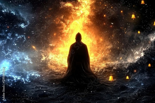 cosmic, fire, universe, space, star, nebula, galaxy, silhouette, figure, monastic, robe, hooded, meditation, contemplation, spiritual, nirvana, mystical, aethereal, fantasy, surreal, artwork, digital artwork, art, painting, illustration, religious, faith, belief, peace, calmness, solitude, journey, destiny, power, energy, light, darkness, balance, duality, yin and yang, celestial, gold, blue, jingle
