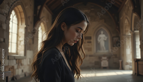 woman, building, architecture, interior, portrait, contemplation, beautiful, historic, ancient, evocative, atmosphere, solitude, peacefulness, reflective, thoughtful, serenity, calmness, elegance, artistic, graceful, calm, style, detail, indoor, indoor, quiet, moment, solace, presence, space, setting, mood, aesthetic, beauty, pose, position, culture, past, memory, bequest, age