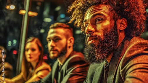 people, friends, evening, meeting, togetherness, conversation, urban, nightlife, gathering, camaraderie, discussion, diverse, pensive, attentive, sophisticated, elegant, thoughtful, stylish, modern, ambience, cosmopolitan, illuminated, chic, relaxed, window, interaction, communication, sharing, enjoying, moment, engaging, observing, contemplating, social, individual, presence, intensity, connection, understanding, listening
