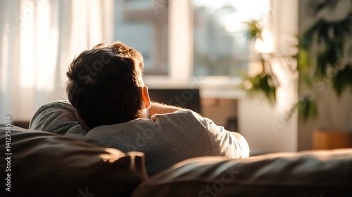 Contemplative Man Relaxing on Couch in Cozy Sunlit Living Room : Generative AI