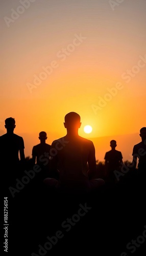 Contemplative outlines in peaceful seated postures against a soft dawn light, quiet, gentle