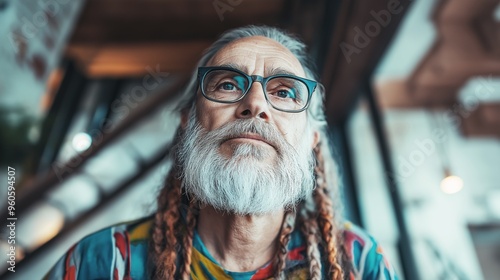 Contemplative senior man with long gray hair and beard looking thoughtful, wearing glasses with a colorful shirt with a pattern.