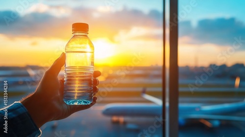traveler, departure, lounge, aerodrome, window, holding, recyclable, water, bottle, sustainability, travel, journey, waiting, contemplation, leisure, moment, explore, adventure, environmental, wanderlust, lifestyle, disposable, alternative, green, living, tour tourism