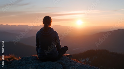 Contemplative Woman Sitting on a Rock Watching a Stunning Sunset : Generative AI
